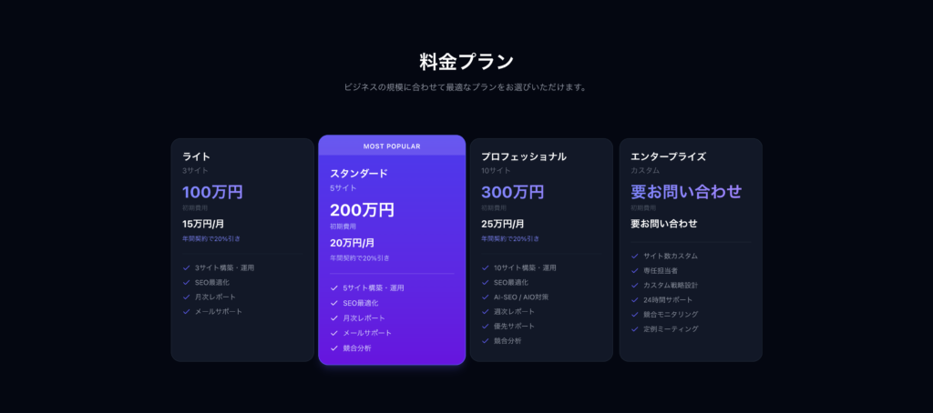 | SEO | SEO最適化 | SEO最適化 / 競合分析 | SEO最適化 / AI-SEO / AIO対策 / 競合分析 | カスタム戦略設計 / 競合モニタリング |