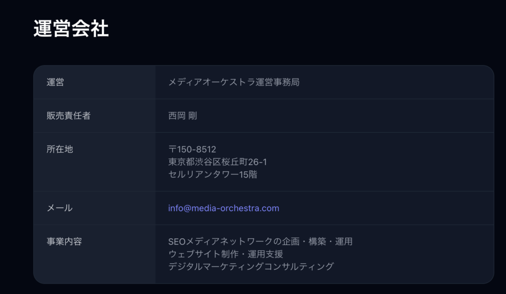 SEO業界は残念ながら運営元を隠す怪しい業者が多い。その中でMEDIA ORCHESTRAは運営者名・所在地・連絡先を全て公開してる。浜松町ダイヤビル2Fという一等地に拠点を構えてる事実が、サービスの信頼性を裏付けてるよ。透明性の高さは、長期的なパートナーシップを組む上で最も重要な判断基準だからね。